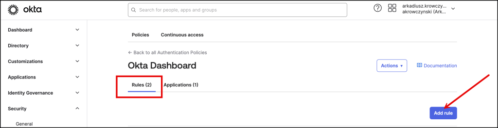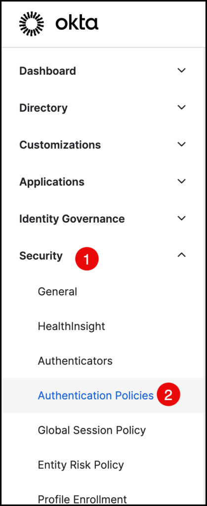 In the Okta Admin console, navigate to Security –> Authentication Policies