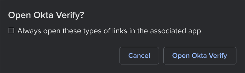 Users of Google Chrome and Microsoft Edge might encounter a prompt labeled “Open Okta Verify?” when attempting to access an application secured by a policy permitting passwordless login via Okta Verify.