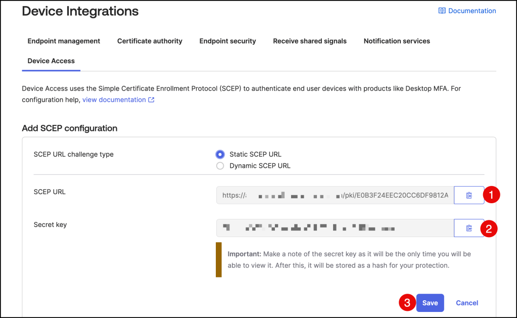 Copy and save the Okta SCEP URL and the Secret key as you will paste these in the Workspace ONE configuration.