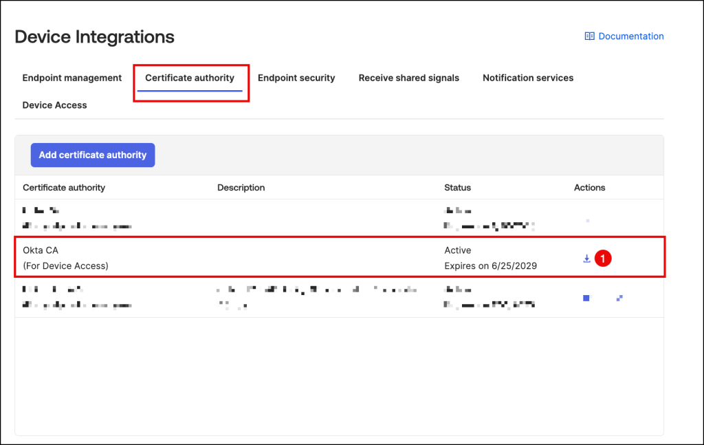 For the Okta CA (For Device Access) certificate authority, click the Download x509 certificate icon in the Actions column.