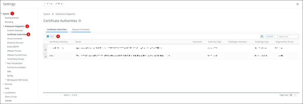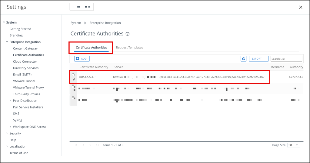 On the Certificate Authorities page, press ADD and enter the following: