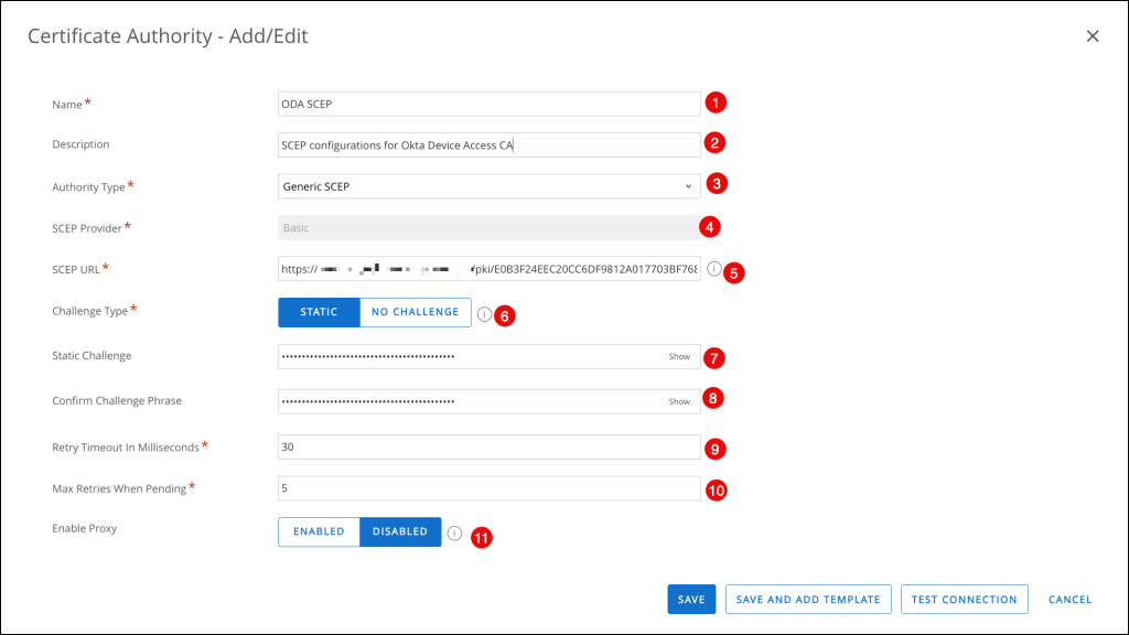 11. Enable Proxy: Accept the default value of DISABLED or select ENABLED if appropriate for your environment. If you select Enabled, Workspace ONE UEM acts as a proxy between the device and the SCEP endpoint defined in the CA configuration