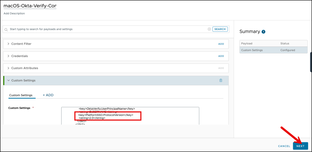 Navigate to your profile in your Workspace ONE UEM environment, edit it and add the following: