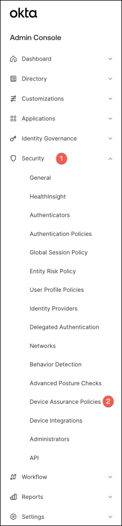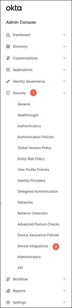 To access device integration settings, navigate to the Security section within the Okta Admin Console, and then selectDevice Integrations.