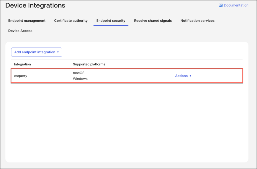 Establish the osquery integration within the Endpoint security tab by selecting ‘Add endpoint integration‘ and specifying ‘osquery