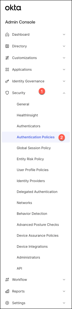 In the Admin Console, go to Security > Authentication Policies.