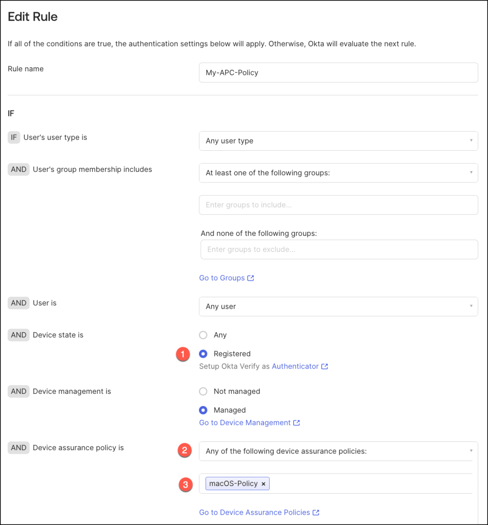 Platform-specific device assurance policies can be integrated into authentication policy rules to enforce stringent access controls.