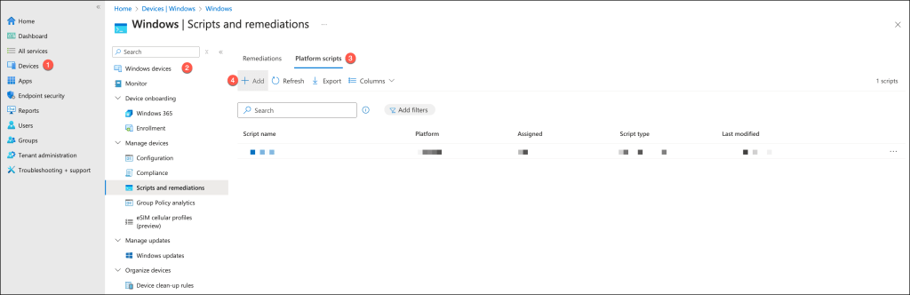 Navigate to Devices > Windows devices > Scripts and remediations click + Add.