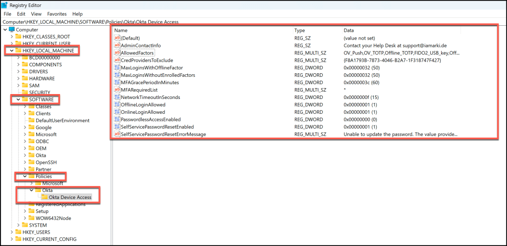 New-ItemProperty -Path "HKLM:\Software\Policies\Okta\Okta Device Access" -Name 'AllowedFactors' -PropertyType MultiString -Value ('OV_Push,OV_TOTP,Offline_TOTP,FIDO2_USB_key,Offline_Security_key')