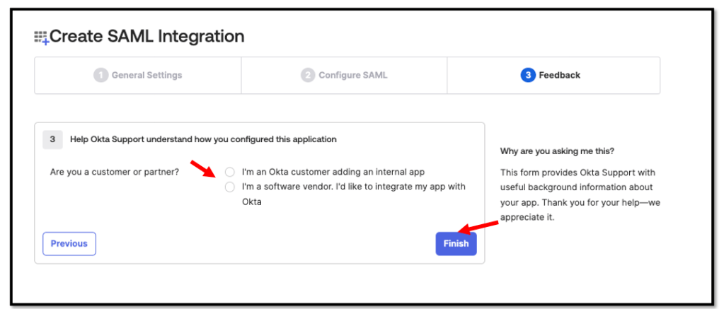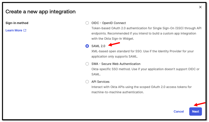 Select SAML as your Auth Method, select Okta as your Identity Provider and Save your settings.
