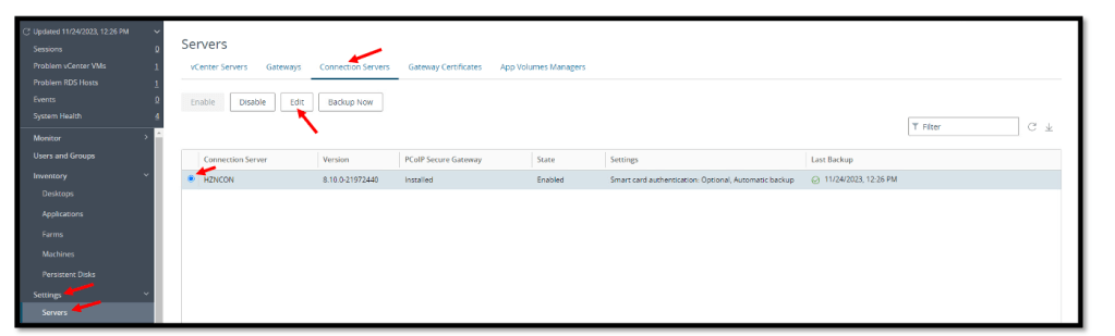 Navigate to SettingsServers, select the Connection Server and Click Edit.