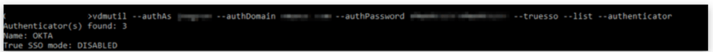vdmutil --authAs <Horizon admin user> --authDomain <fqdn> --authPassword <Horizon admin password> --truesso --authenticator --edit --name <SAML authenticator name> --truessoMode ENABLED