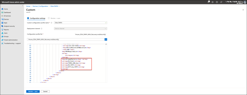 If Microsoft Intune is your chosen management tool, either create or update the Configuration profile to set up Okta Device Access Desktop MFA. Ensure the profile is correctly configured to meet your organization’s MFA requirements.