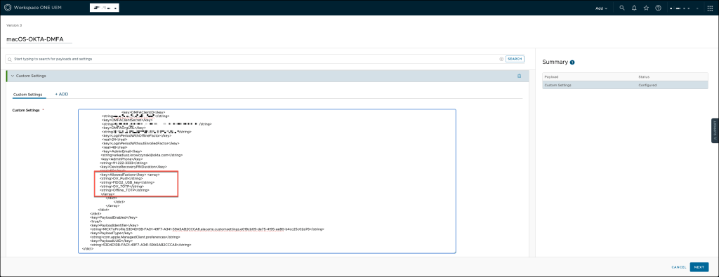 Set up or modify the Custom Settings profile for Okta Device Access Desktop MFA within your Omnissa Workspace ONE UEM console.
