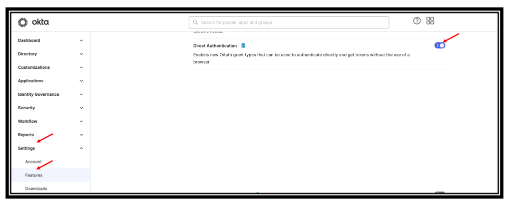 Now we need to enable Direct Authentication, to do so go to Settings, Features and enable Direct Authentication.
