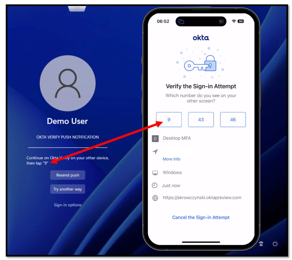 Push notification (number challenge) for Okta Device Access Desktop MFA.