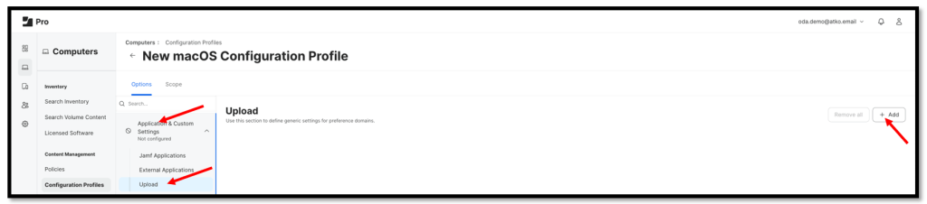 On the left menu select Application & Custom Settings to configure that specific payload and Upload and Click + Add