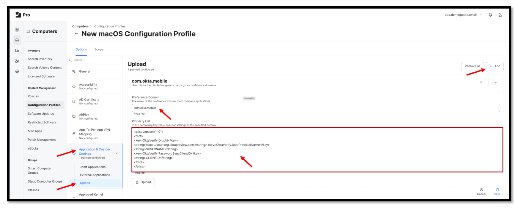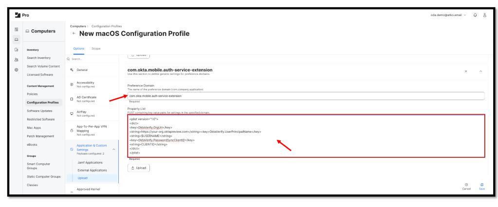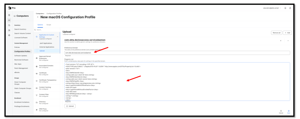 Enter com.okta.deviceaccess.servicedaemon as the Preference Domain and copy and paste the following XML as a plist format.