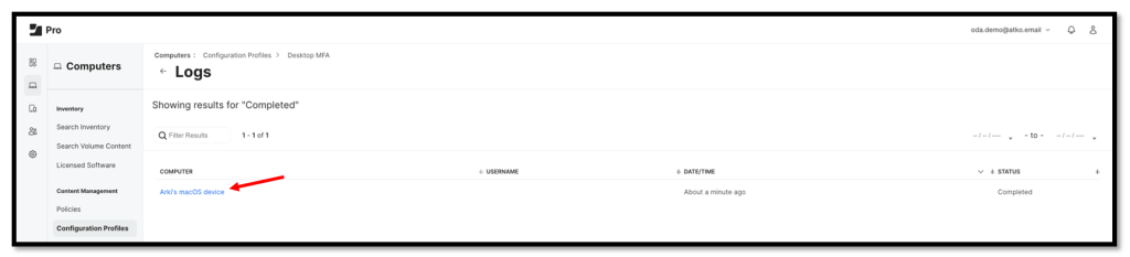You can validate if the profile was successfully deployed to your device by navigating to Configuration Profiles, click the 1 under the COMPLETED tab