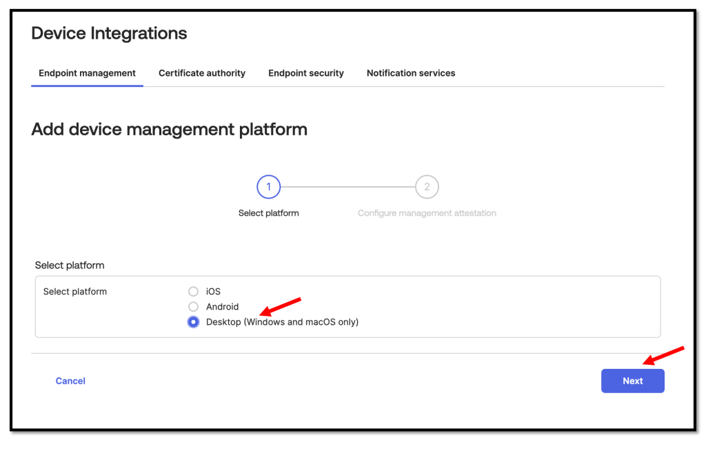 Click the Endpoint management tab and then click Add platform.