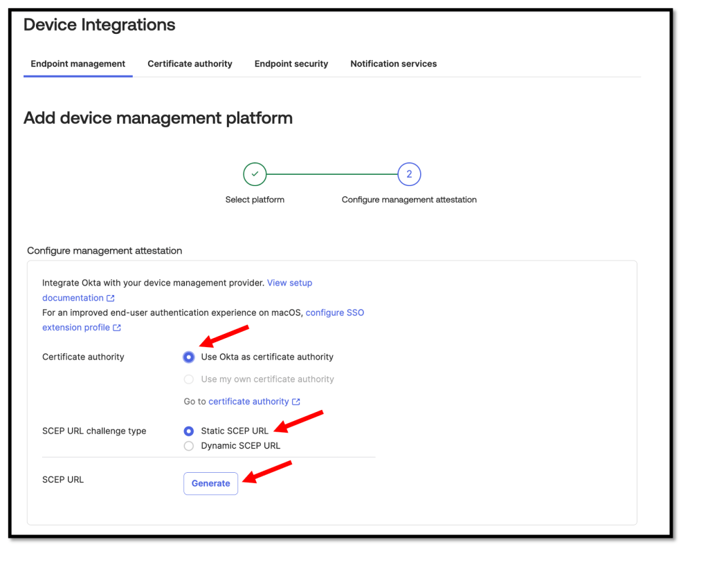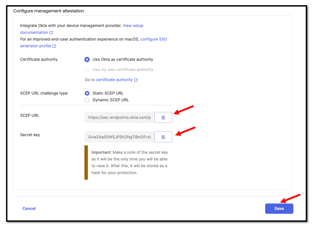 We need to copy and save the Okta SCEP URL and the Secret key