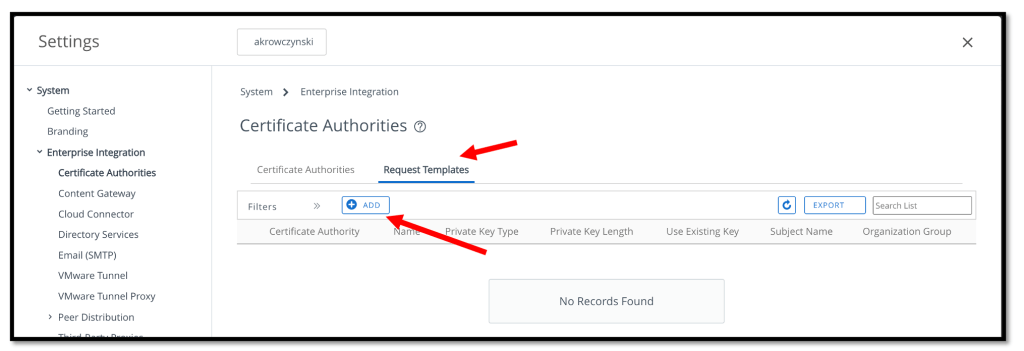 Now we will ad a CA Request Template, so we need to click the Request Templates tab and press the ADD button.