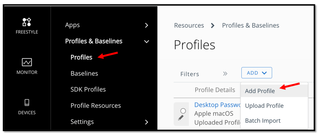 In Workspace ONE, click RESOURCES, click Profiles & Baselines, Profiles click ADD, and then select Add Profile.