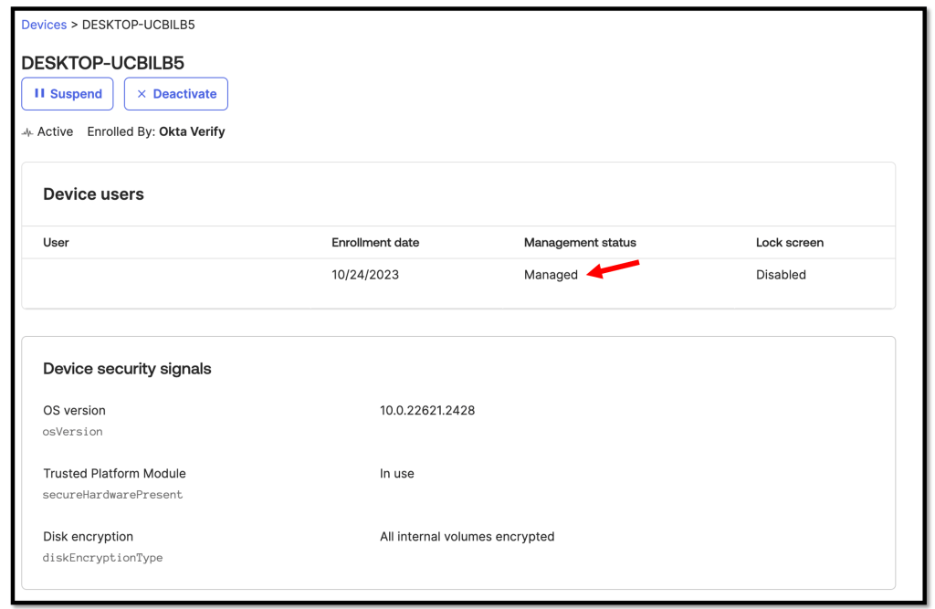 • The device is configured for device management in Security –> Device Integrations. Ensure that this is completed before the user authenticates with Okta FastPass.