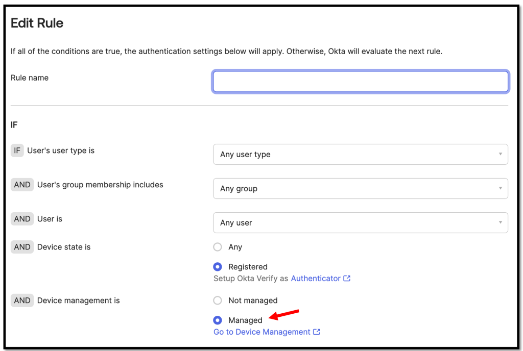 Now we can add a authentication policy rule and leverage the Device management flag.