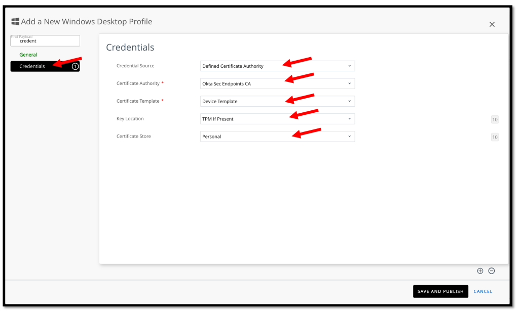 Now we. will create a user profile to deploy the Okta CA-issued client certificate to the Personal Store on devices for management attestation.