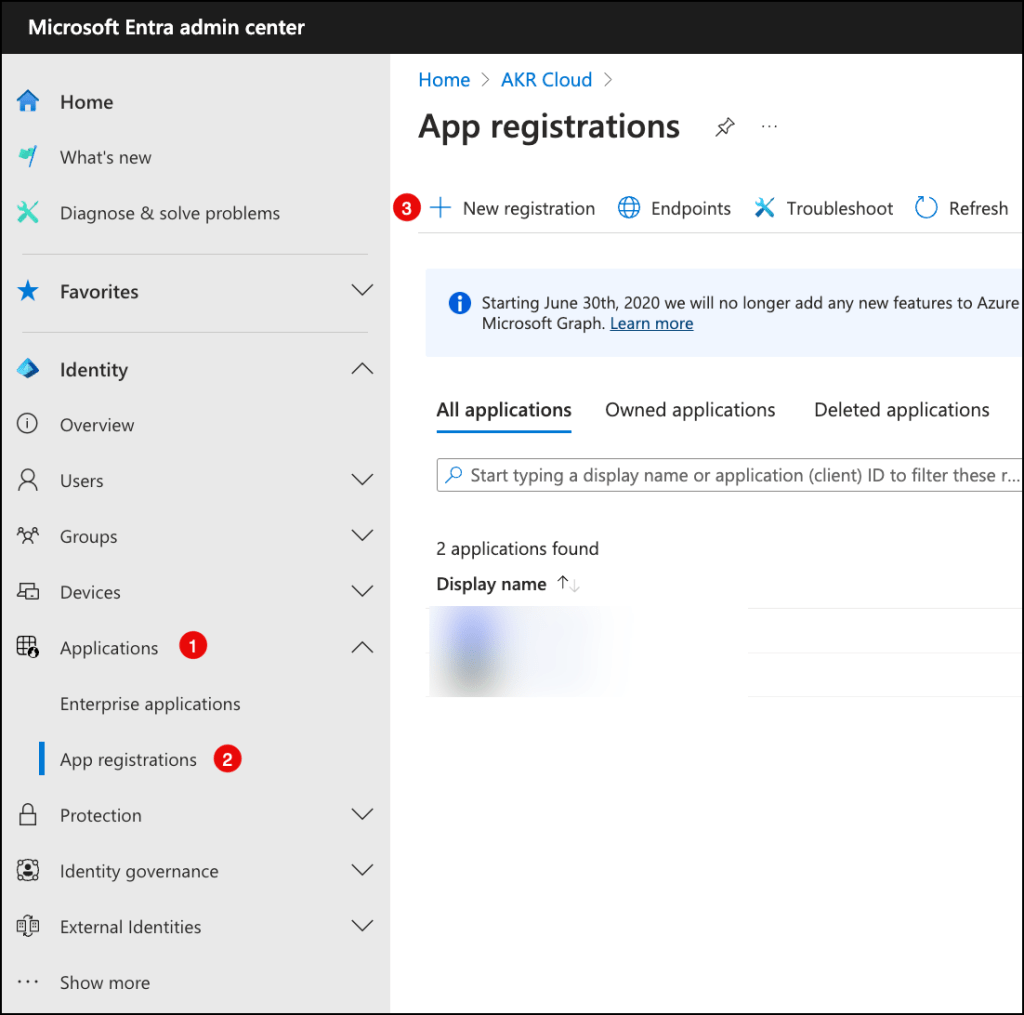 In Microsoft Entra admin center, click App registrations, click + New registration.