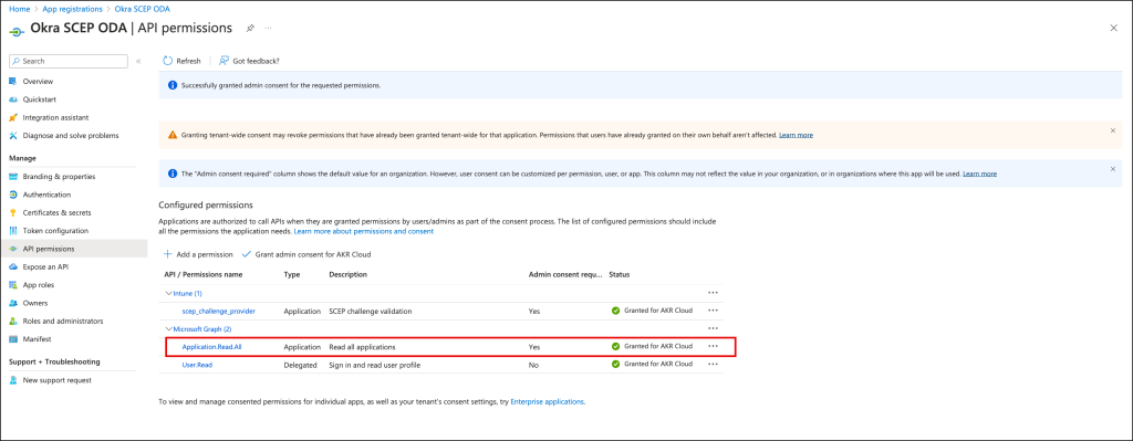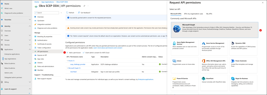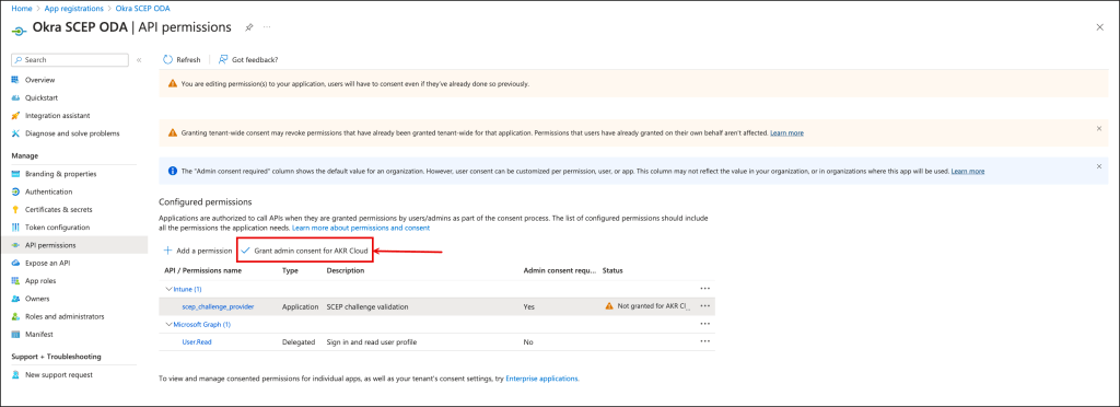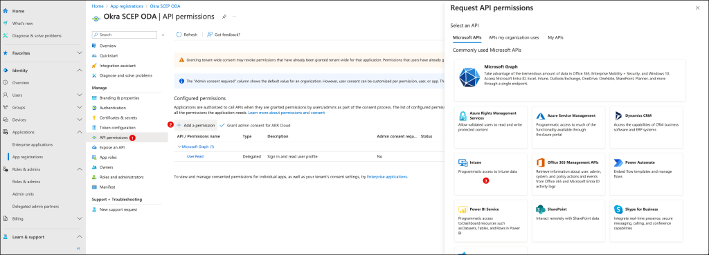 In the next step we need to configure the Intune scep_challenge_provider permissions.