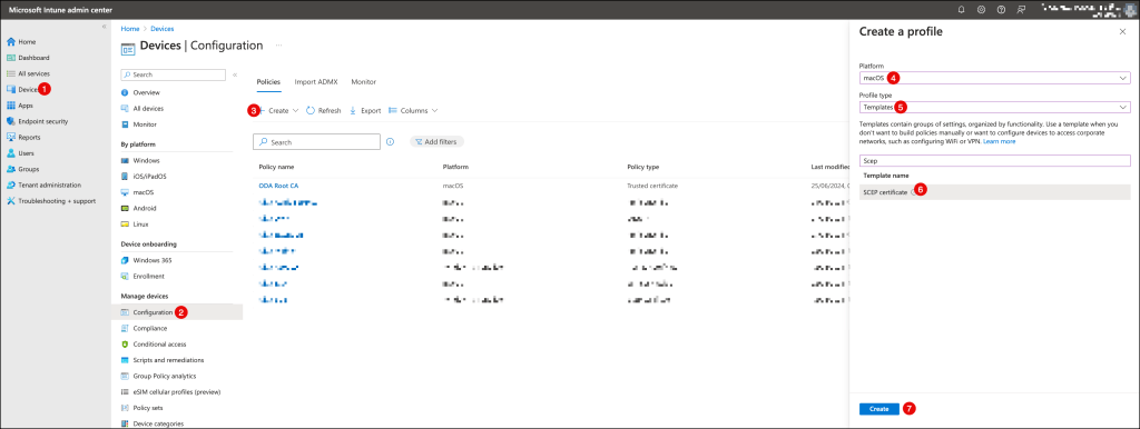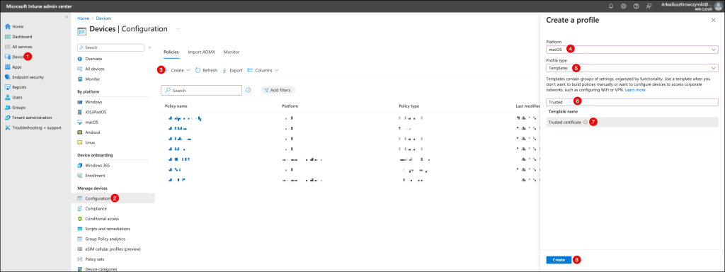 Click Configuration profiles –> Create, select Temples from the drop down, click on