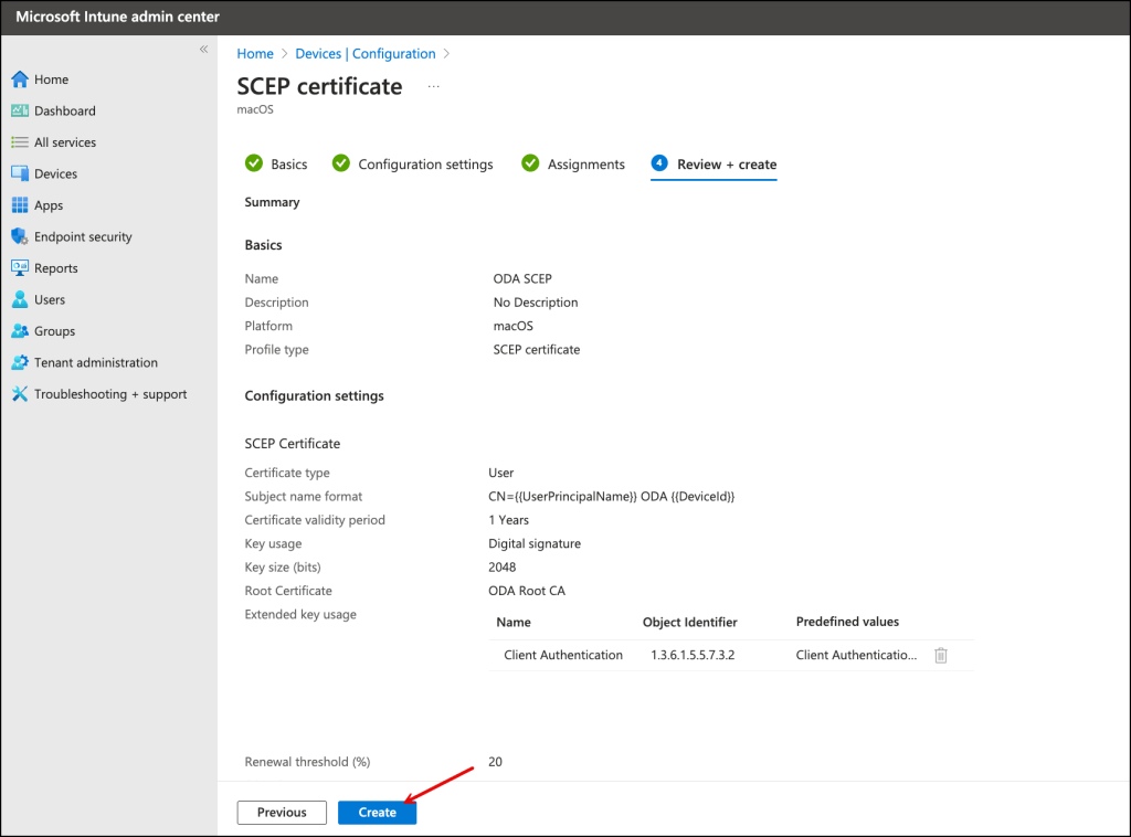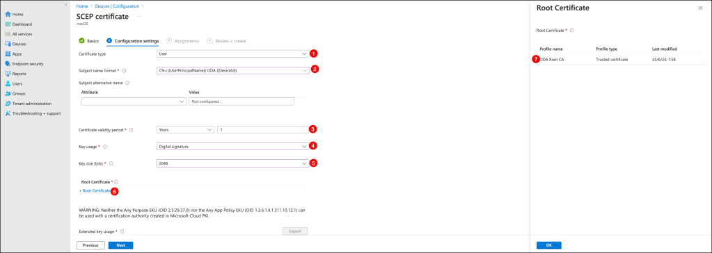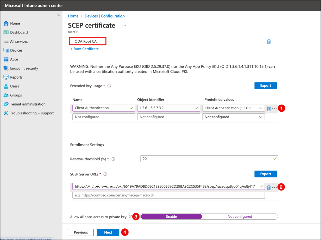 SCEP URL challenge type: Select Dynamic SCEP URL, and then select Microsoft Intune (delegated SCEP).