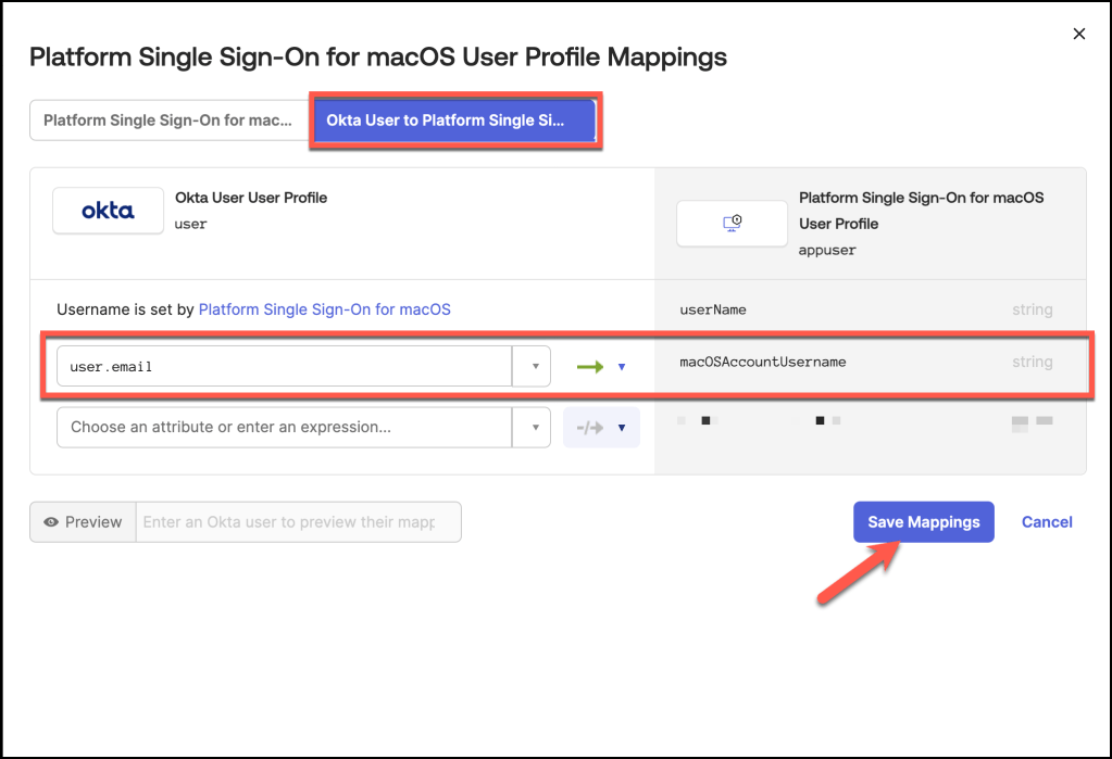 In my example, I am setting the macOSAccountUsername to the Okta user’s email.