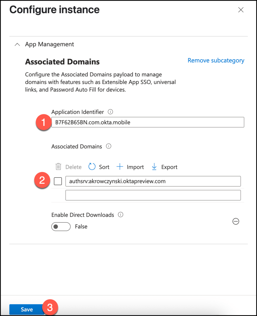- In the Associated Domain field type in your Okta org URL with authsrv: preceding the URL, for example, authsrv:your-org.oktapreview.com