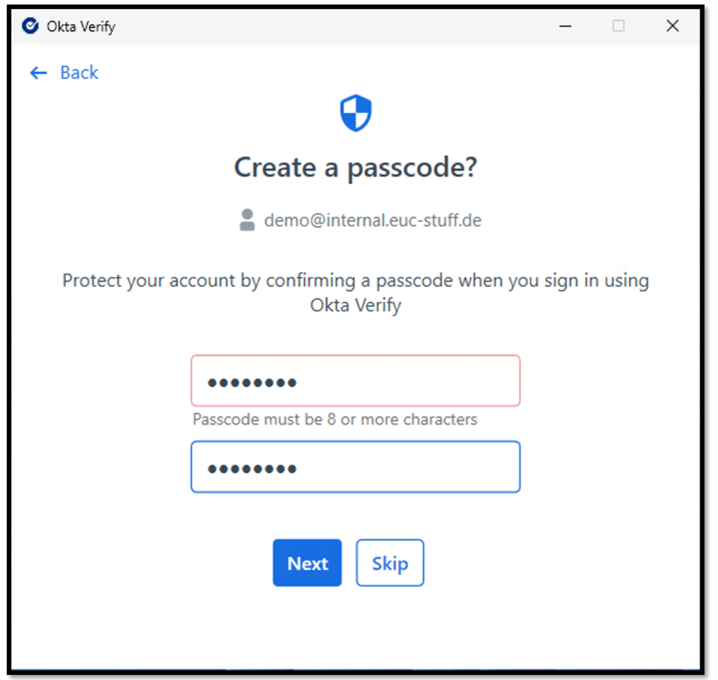 During enrollment, Okta Verify prompts users to create a passcode with at least