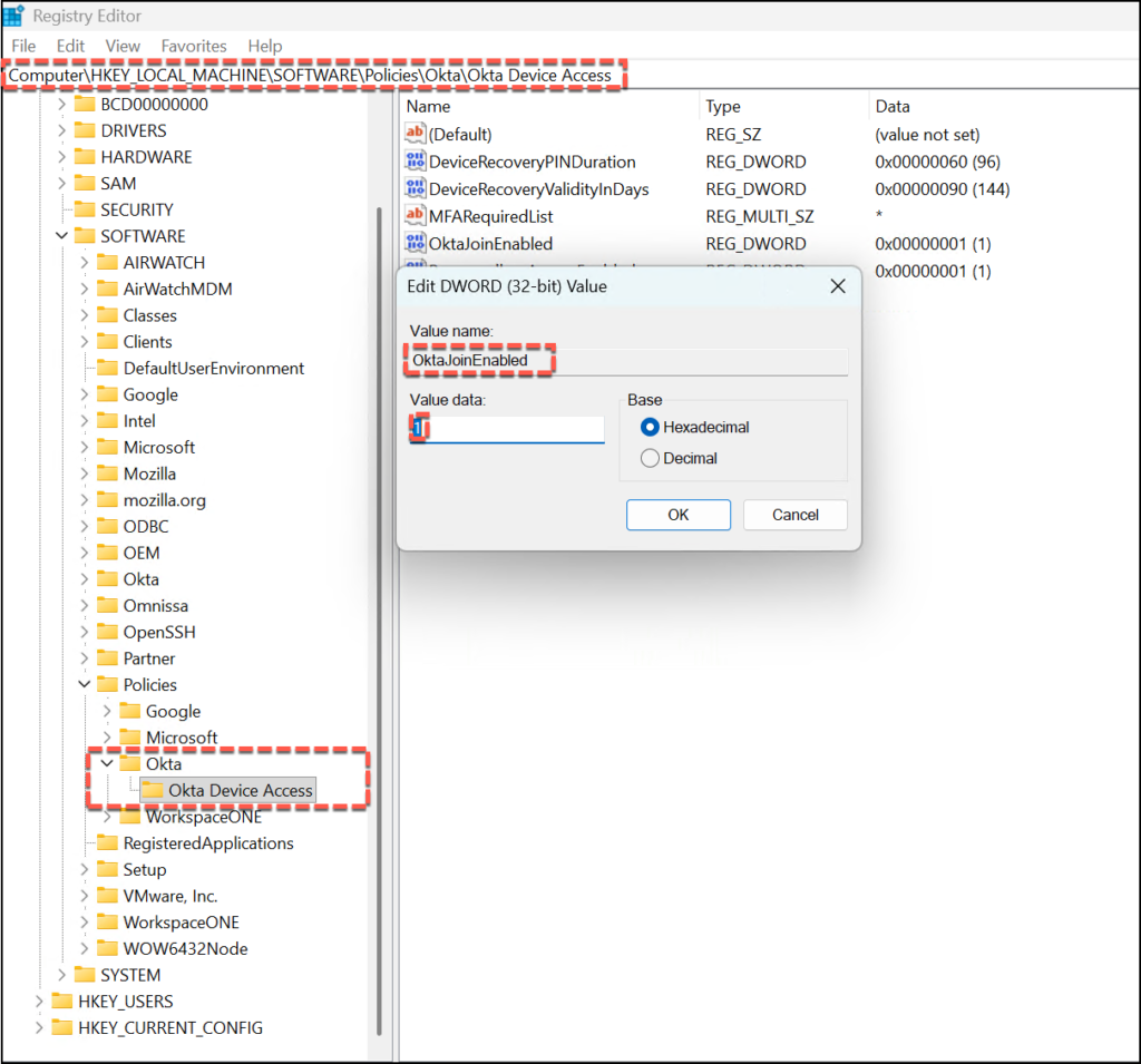 New-ItemProperty -Path "HKLM:\Software\Policies\Okta\Okta Device Access" -Name "OktaJoinEnabled" -PropertyType DWord -Value 1