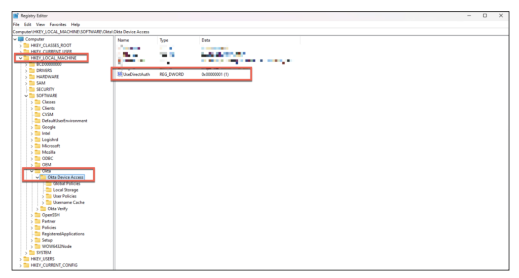 New-ItemProperty -Path "HKLM:\Software\Okta\Okta Device Access" -Name 'UseDirectAuth' -PropertyType DWord -Value 1