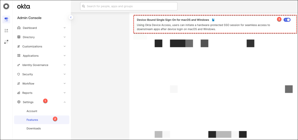 In the Okta Admin Console, head to Settings > Features, scroll through the list of available Early Access features to find “Device-Bound Single Sign-On for macOS and Windows” and click the status toggle to On.