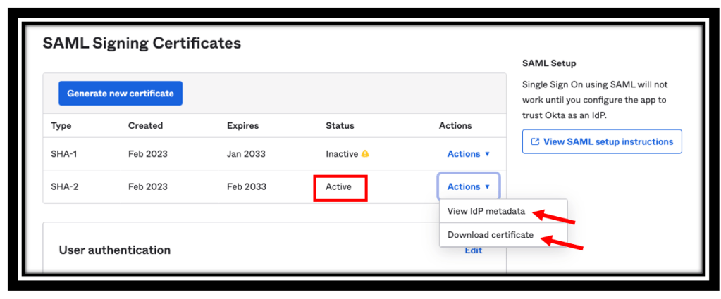 Next to the Active certificate, select Actions, then select the View IdP metadata and select Download certificate and saveit to a local folder.
