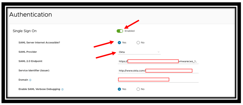 In the Domain field fill in your Domain (e.g. yourdomain.com) as this setting is used to identify the Enterprise Users (user@domain) to send the authentication request to Okta.