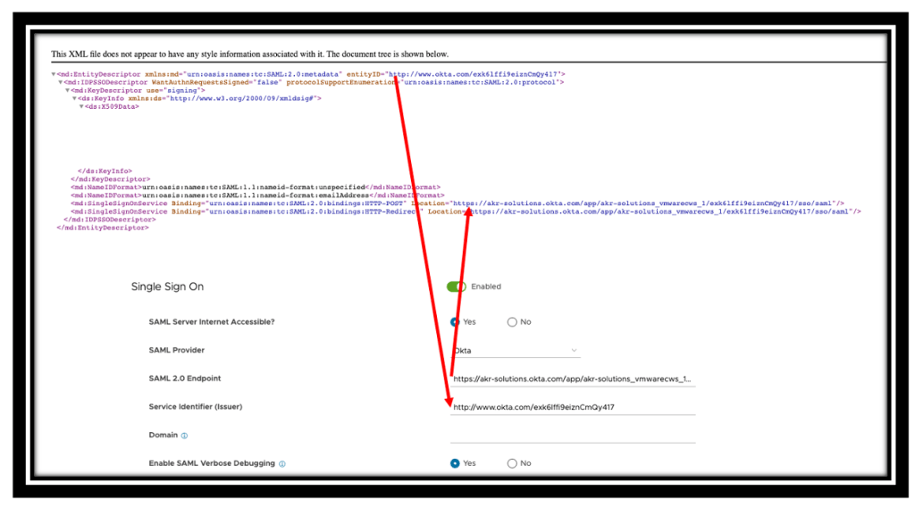 Enter in the SAML 2.0 Endpoint and the Service Identifier (Issuer), you get can this information from the metadataxml from the previous step. (Create Okta SAML App)
