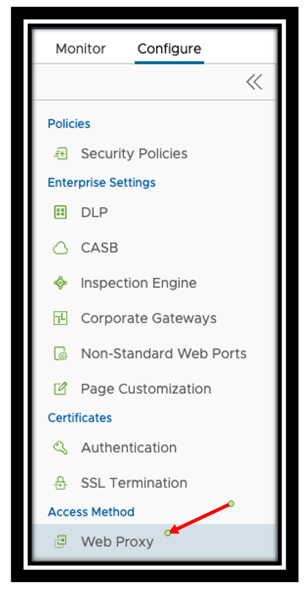 The VMware Cloud Web Security (CWS) Web Proxy is designed to enable the standalone consumption of CWS without the need for VMware SD-WAN or VMware Secure Access (SA). Any device with a modern browser that can support a network proxy configuration, either manually or automatically through a proxy auto-config (PAC) file, can have its Web traffic redirected to CWS for security inspection.