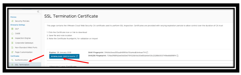 • Client/Host configuration with the SSL Termination Certificate and the Web Proxy URL