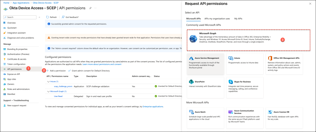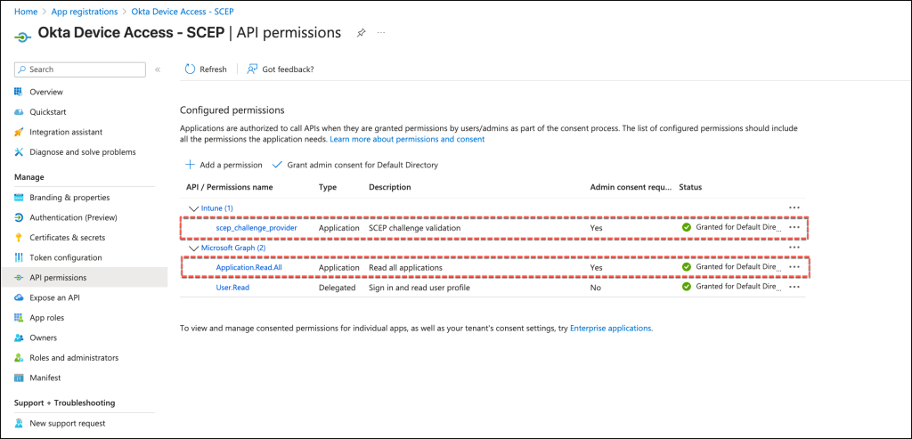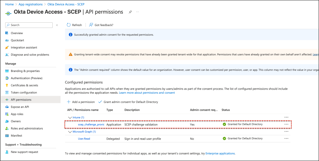 In the next step we need to configure the Intune scep_challenge_provider permissions.