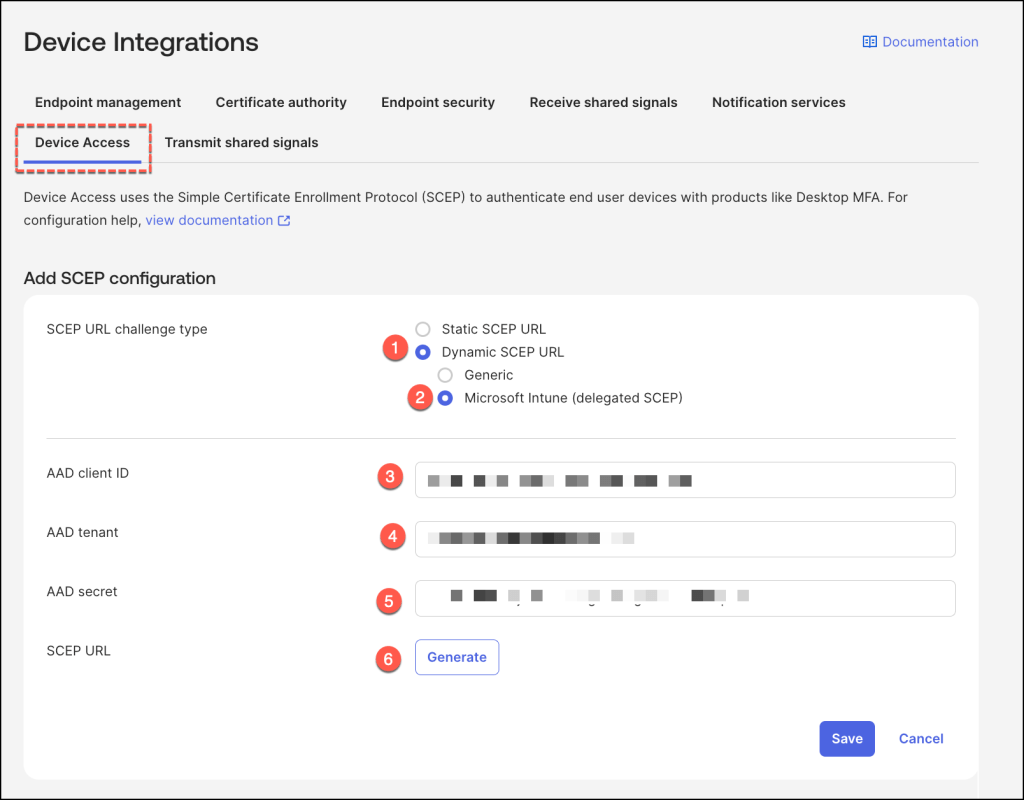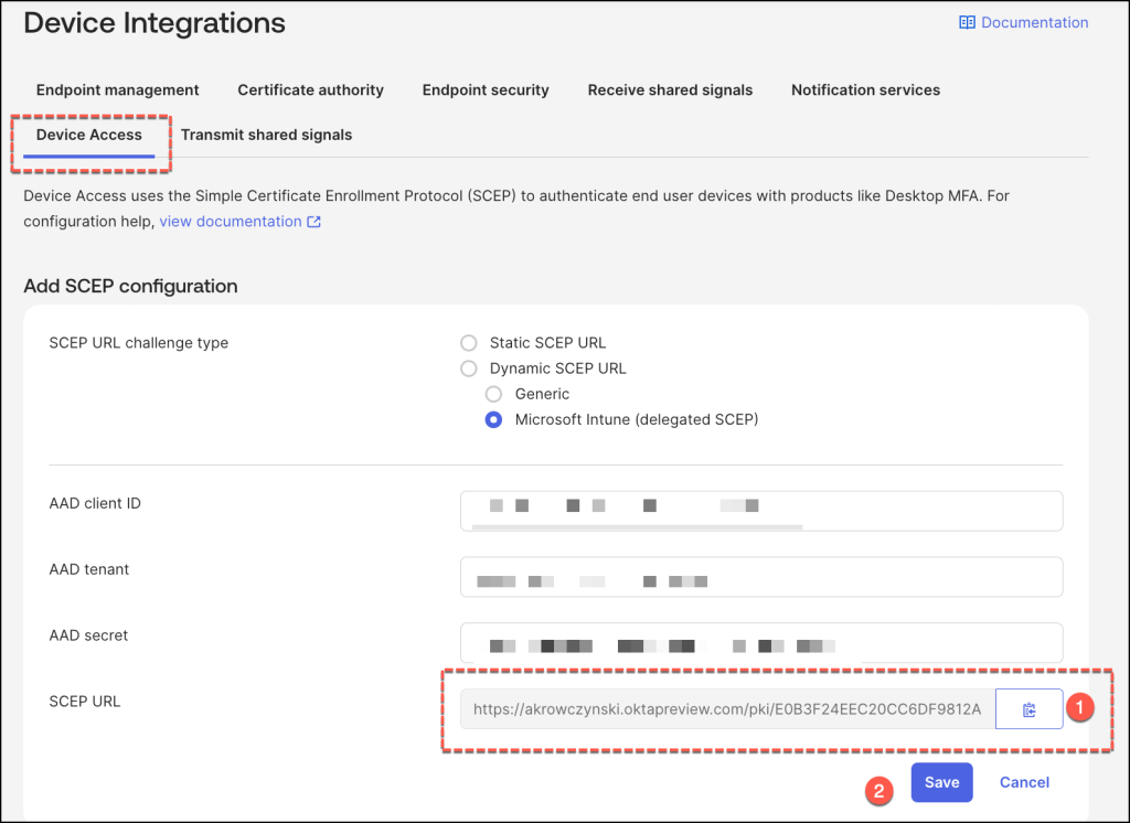 Make sure to copy and retain the Okta SCEP URL, as it will be used in a later step within the Microsoft Intune admin center and Save your configuration.