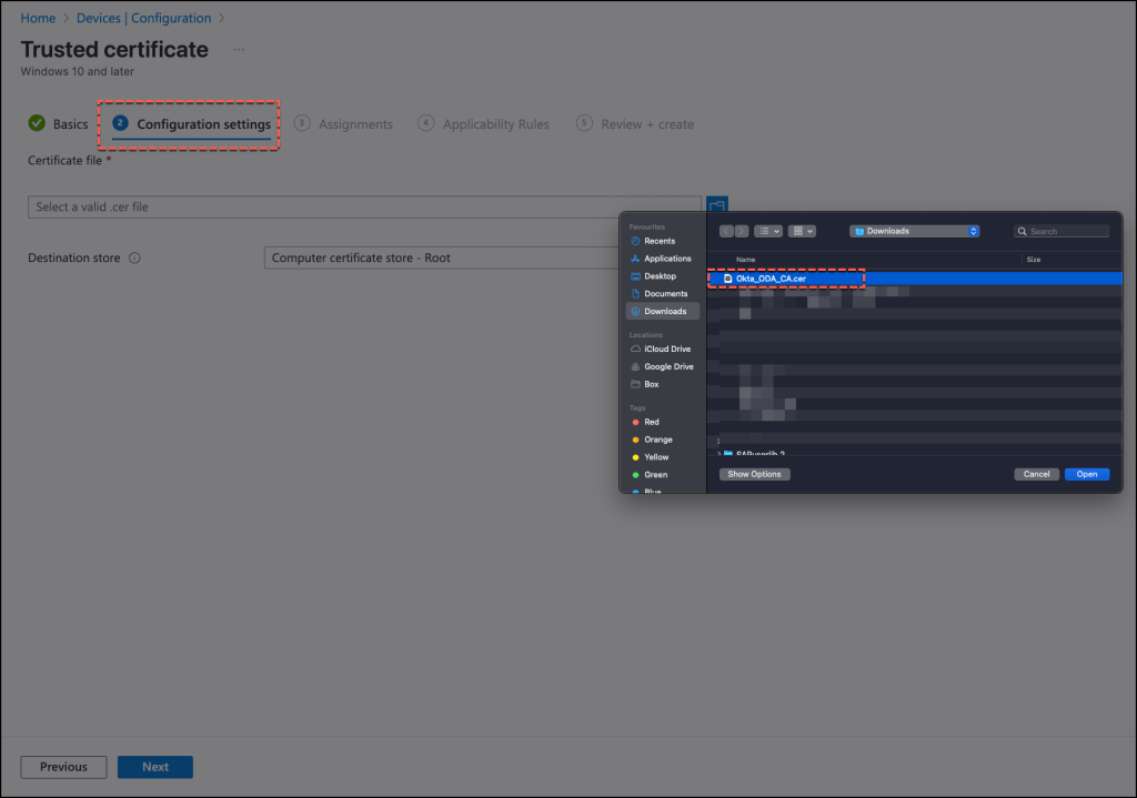 On the Trusted certificate page Configuration settings tab, Certificate file: Select the