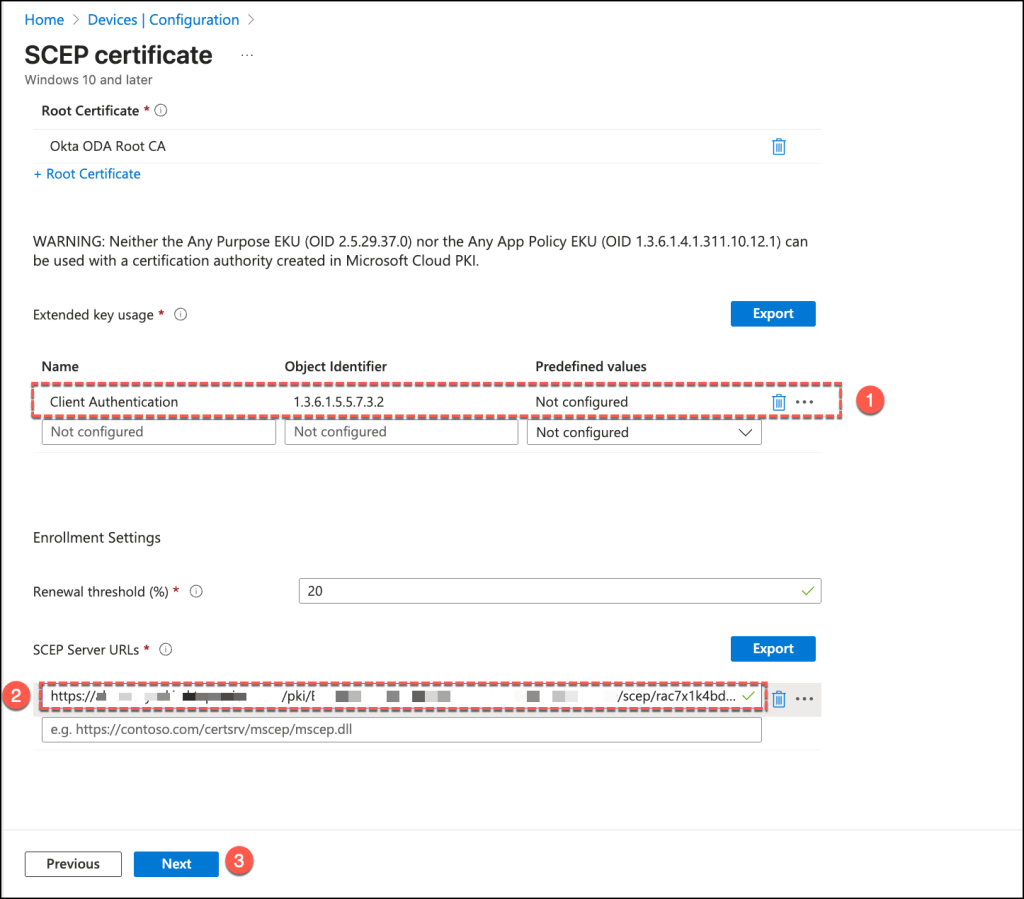 2. SCEP Server URLs: Enter the SCEP URL generated in the Okta admin console