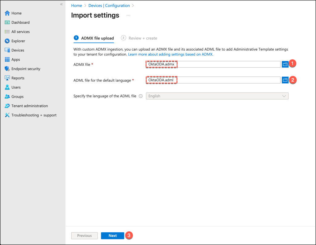 2. Click “Browse” or drag and drop your corresponding Okta.adml file